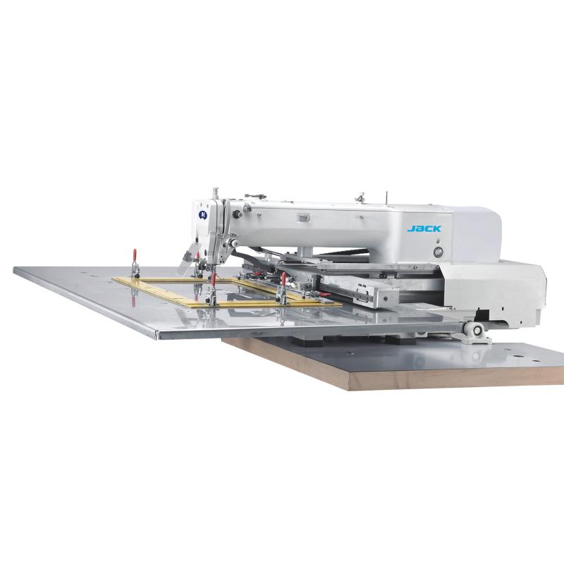 JK-T6035 é uma máquina de filigrana eletrônica programável capaz de costurar um campo de até 600x350mm. Além de possuir todas as funções das filigranas normais esta máquina ainda possui um sistema simples de remoção da garra de trabalho, possibilitando que o processo de costura e de descarte aconteçam simultaneamente (quando utilizam-se duas garras de trabalho), diminuindo o tempo de ciclo da máquina e aumentando consequentemente a sua eficiência. O avançado mecanismo de movimentação dos eixos torna os movimentos mais suaves. Baseada nas fortes funções das filigranas eletrônicas programáveis BRUCE e em sua caixa de controle avançada, a máquina pode detectar mal manuseio por parte do operador. Vastamente utilizada na área de calçados e cases protetoras.
