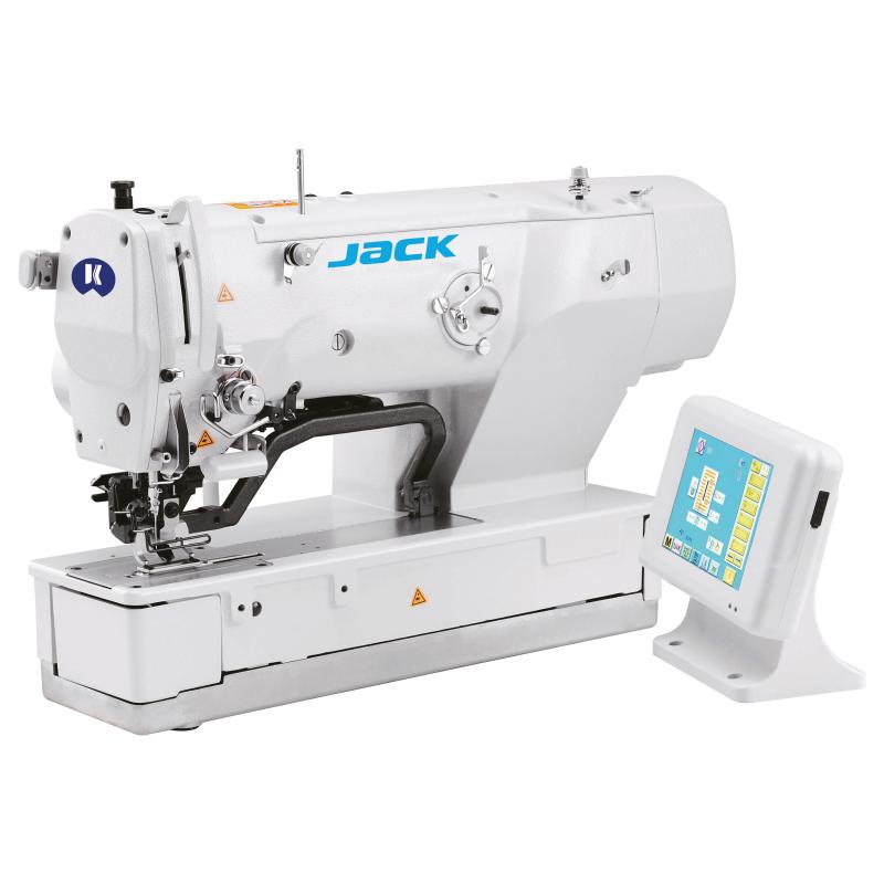 Máquina de costura industrial tipo caseado reto eletrônica, equipada com motor servo direct drive, sistema de faca com corte sequencial para abrir o caseado. Painel de controle tipo "touch screen", sensor automático de quebra de linha, equipada com cinco motores de passos, podendo fazer ate nove reforços antes do caseado e um depois, com lubrificação automática.